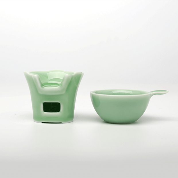 茶具色泽翠绿,与茶汤相映成趣,相得益彰,令人爱不释手,堪称美器。